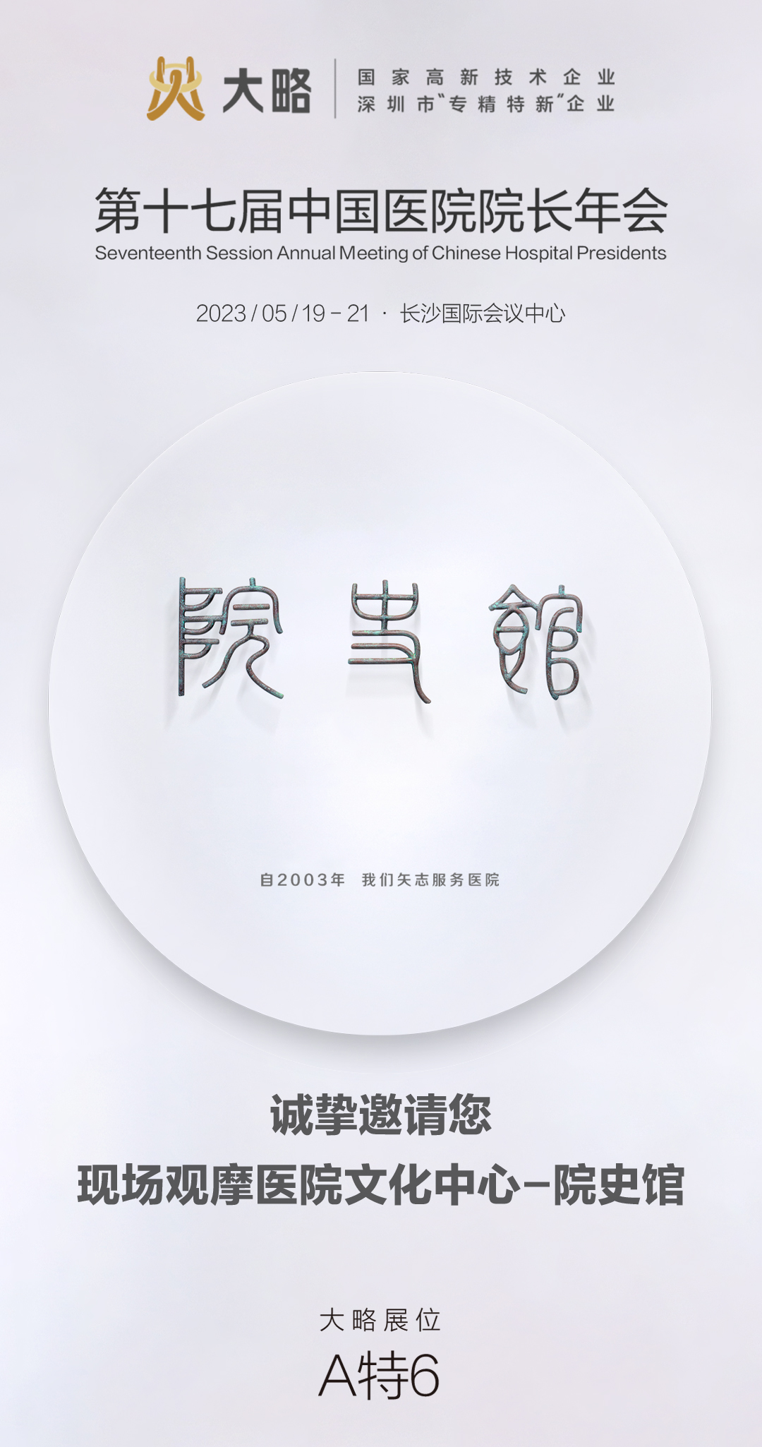 作为“国家高新技术企业”、深圳市“专精特新”企业,“中国医院院史馆建设标准”的参与制定者,大略公司多年来在创意设计、高新技术、先进制造上持续发力,不断创新和突破,致力于推动医院文化建设和提升。全国500+医院设计案例欢迎您5月19日-21日在长沙国际会议中心A特6展位与我们交流,并邀请您现场观摩医院文化中心-院史馆。