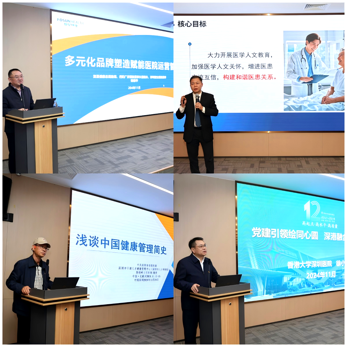 随后,大会以“医院内训师培养与文化建设”为主题展开了学术讨论。其中市委组织部市人才研修院(市干部人才健康管理中心)健康部部长陈晓峰、香港大学深圳医院党委书记徐小平、深圳市龙华区中心医院党委书记王光明、复星健康总裁助理杨德华等都发表了主题讲话,为现场带来了前沿的思考与启示。